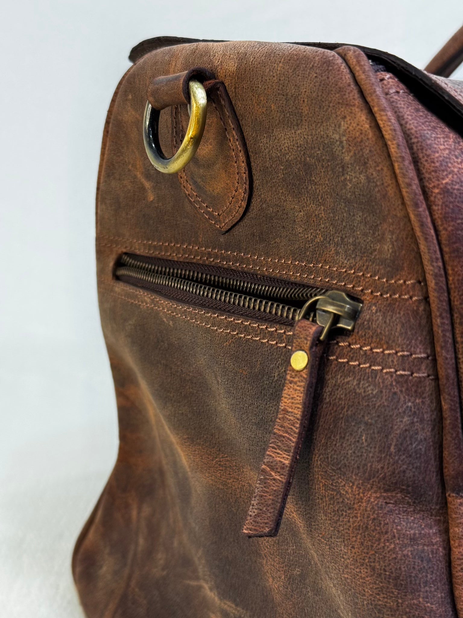 • Top zipper concealed beneath a leather flap with side belt-style clasp
